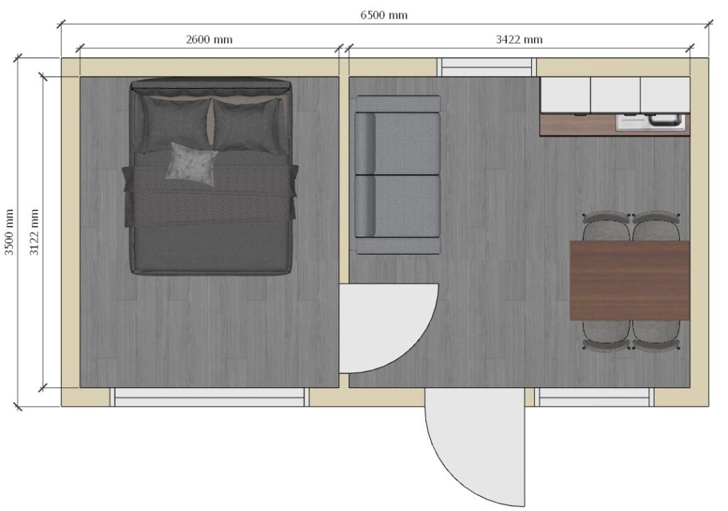 Yhdistää majoittumisen ja oleskelun samaan tilaan. Sopii vierasmajaksi tai pieneksi mökiksi, jossa kaikki oleellinen on lähellä. Tunnelmallinen ja käytännöllinen kokonaisuus.